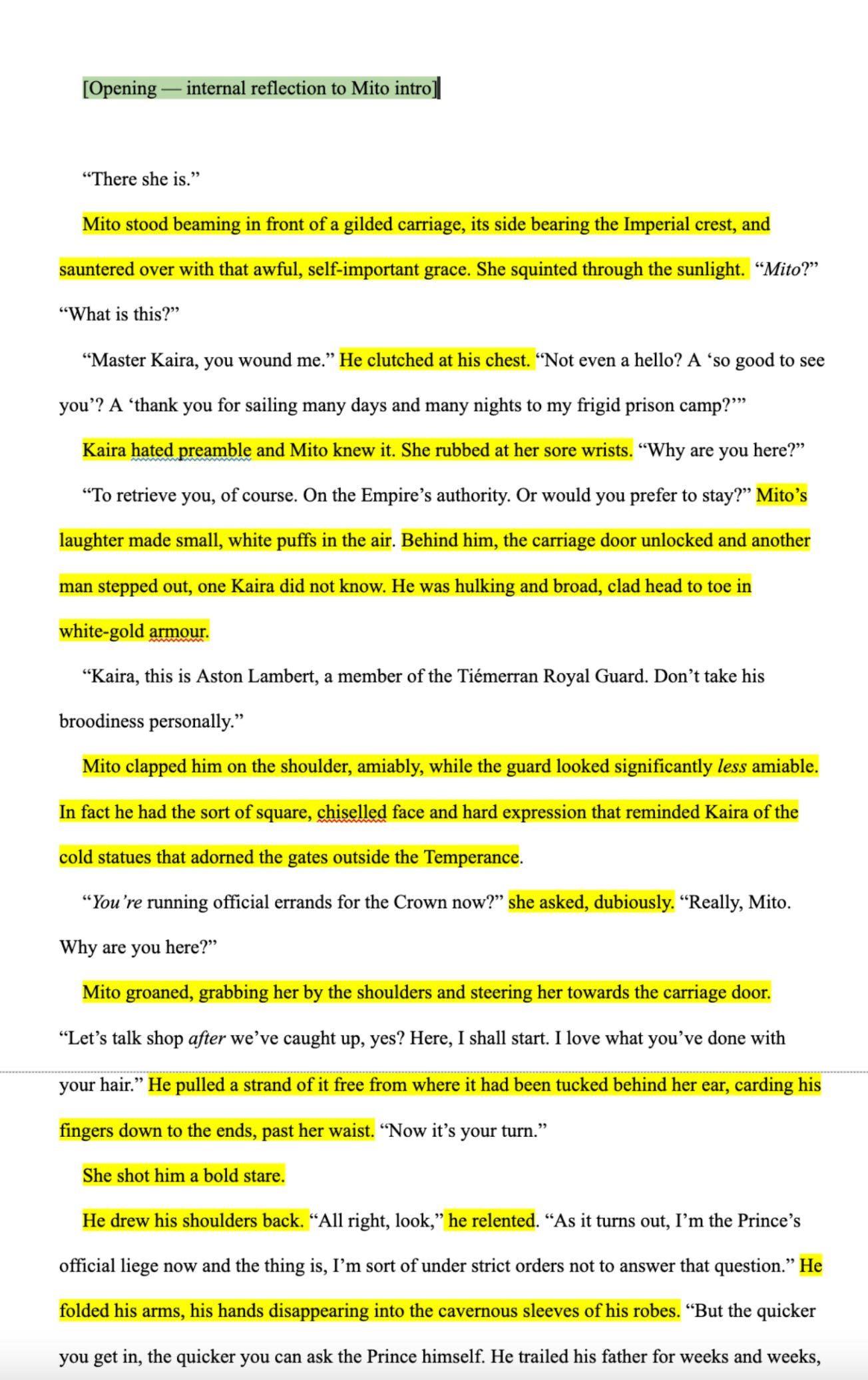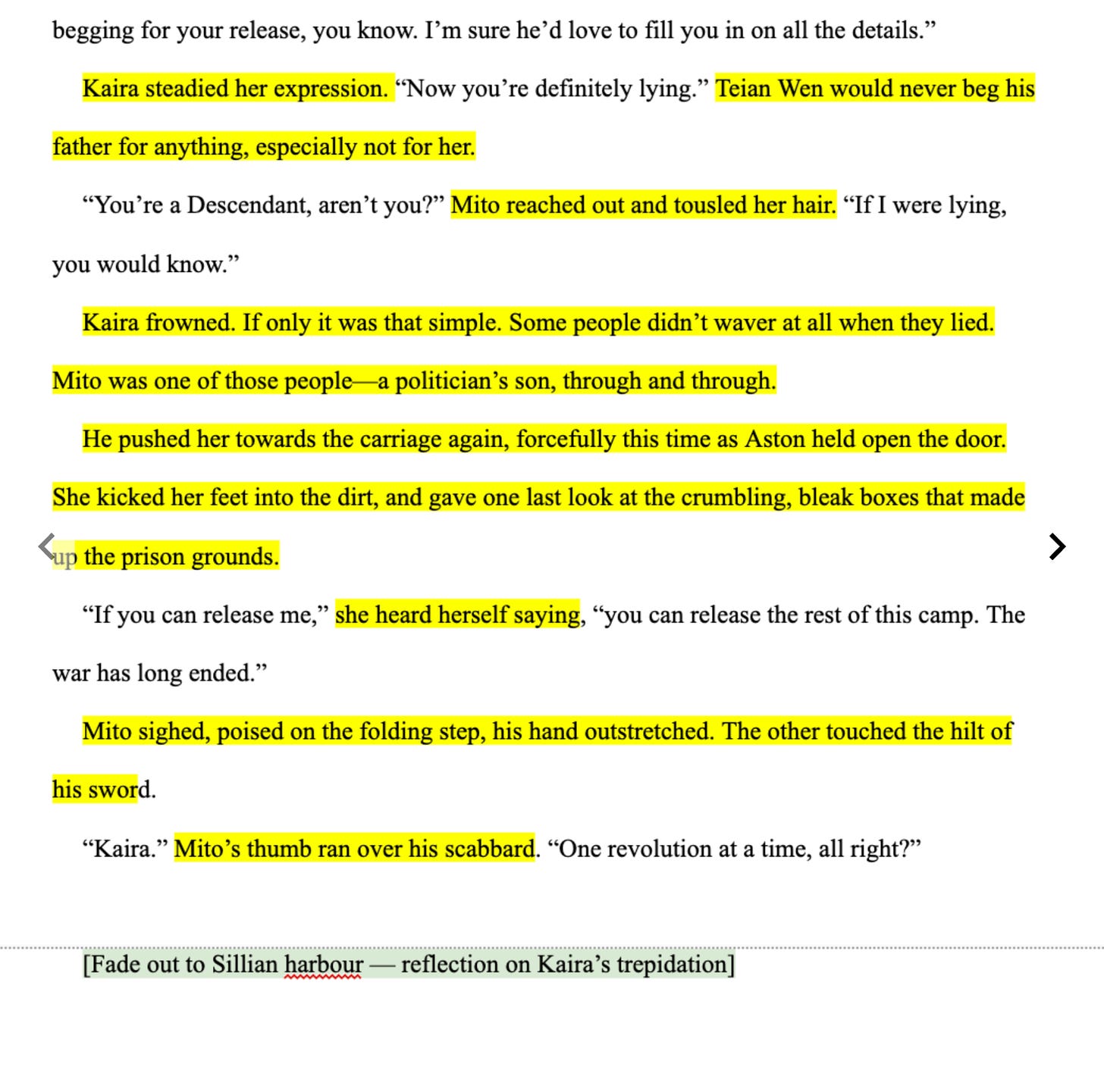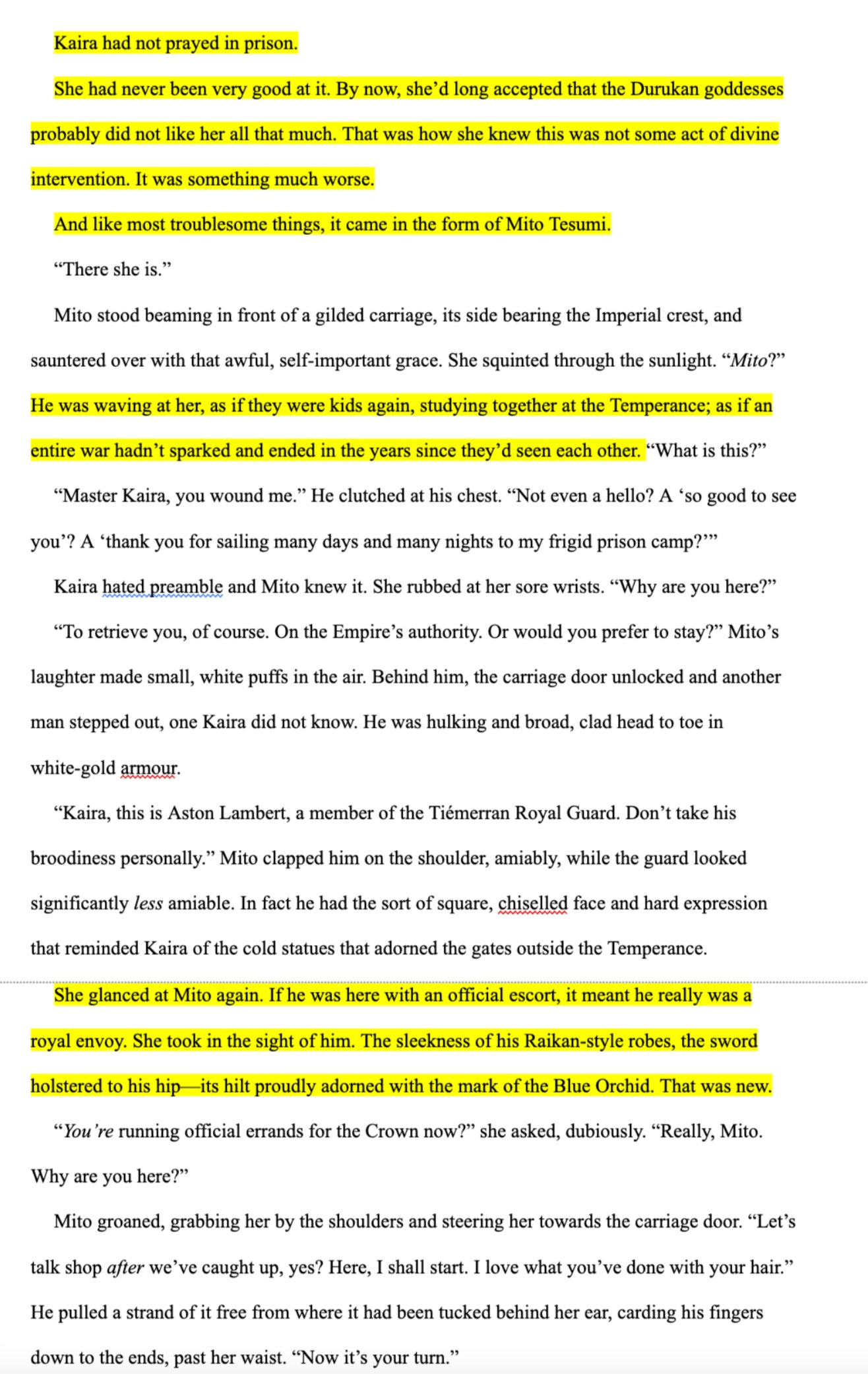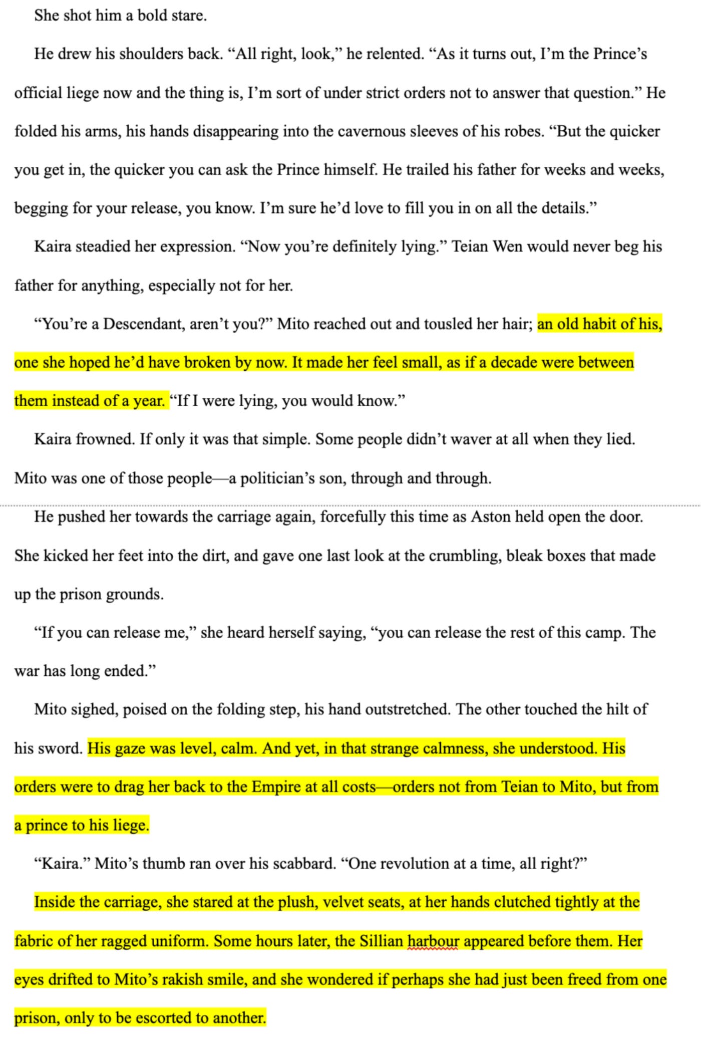 For context: the perspective character, Kaira, has just been released from her prison sentence early. She realizes it's at the behest of the Crown (who she distrusts for ~reasons~) and she is being escorted from the prison by an old friend, currently in the employ of the Crown.